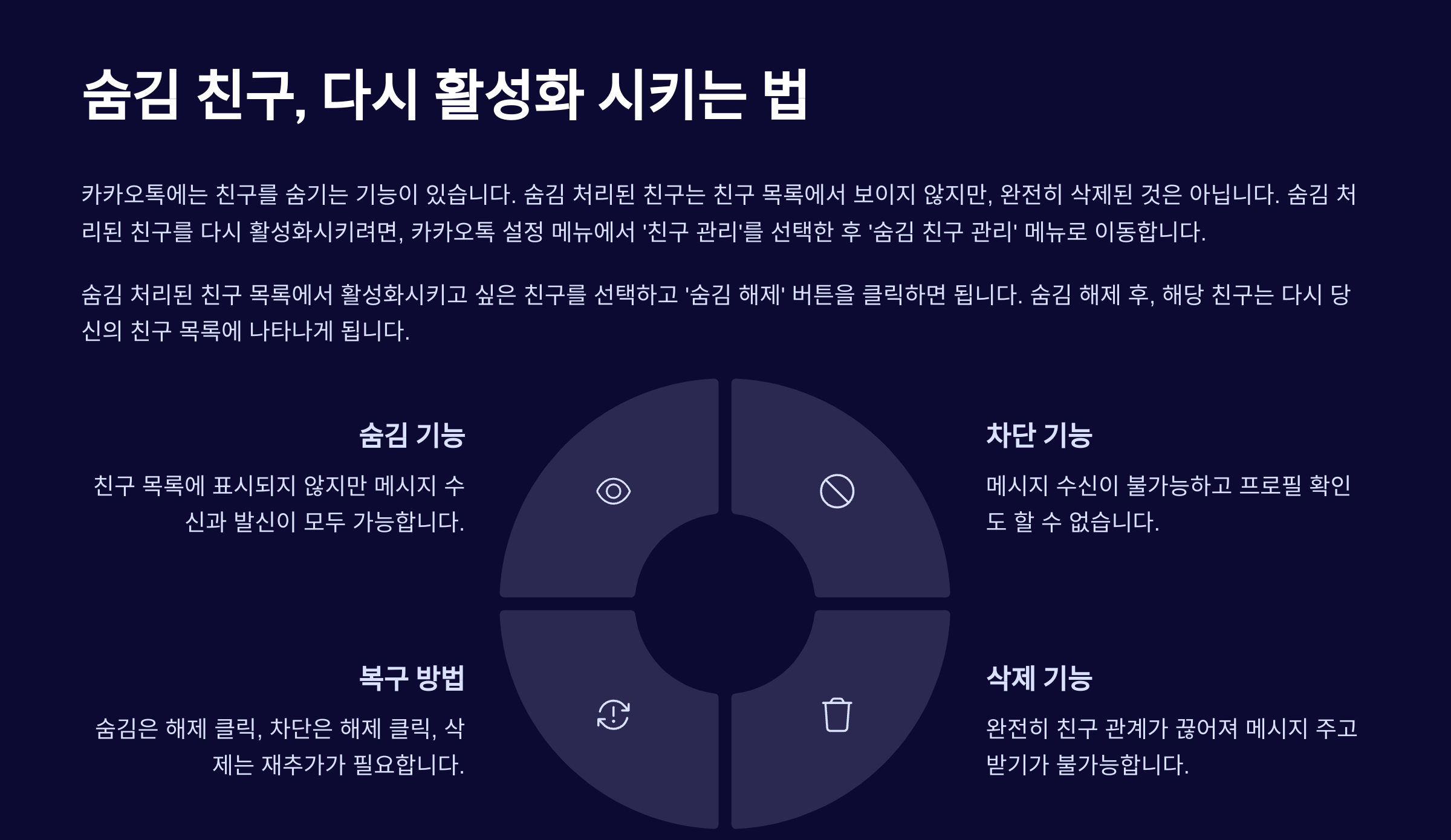 | 복구 방법 | 숨김 해제 클릭 | 차단 해제 클릭 | 재추가 필요 |
