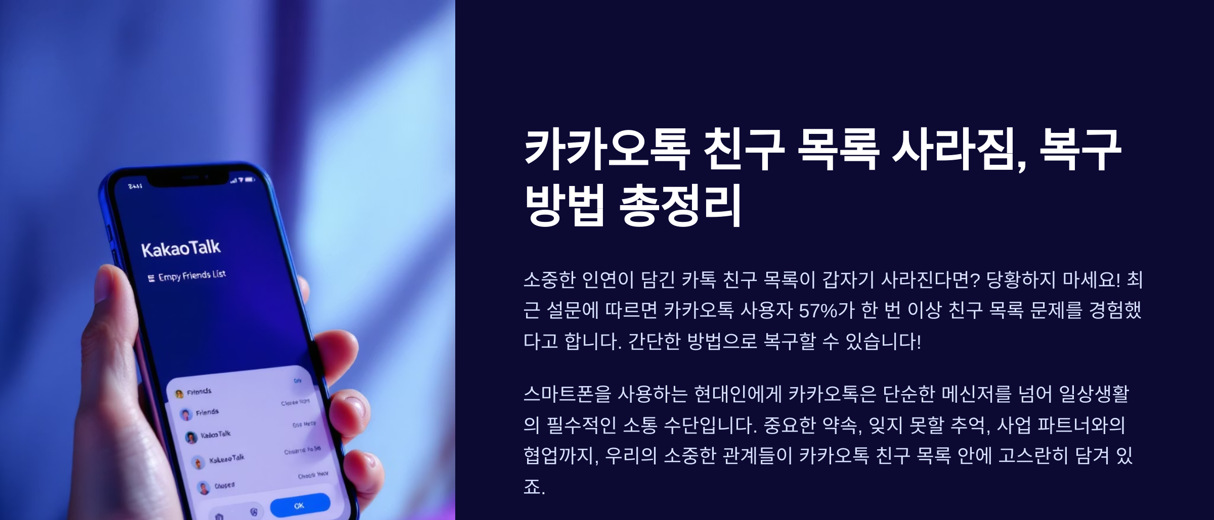 스마트폰을 사용하는 현대인에게 카카오톡은 단순한 메신저를 넘어 일상생활의 필수적인 소통 수단입니다. 중요한 약속, 잊지 못할 추억, 사업 파트너와의 협업까지, 우리의 소중한 관계들이 카카오톡 친구 목록 안에 고스란히 담겨 있죠. 그런데, 갑자기 예상치 못한 순간에 카톡 친구 목록이 텅 비어버린다면 어떨까요? 마치 세상과의 연결이 끊어진 듯한 불안감과 답답함이 밀려올 것입니다. 중요한 연락처를 잃어버렸을까 봐, 혹은 실수로 친구를 삭제했는지에 대한 걱정이 머릿속을 가득 채우겠죠.