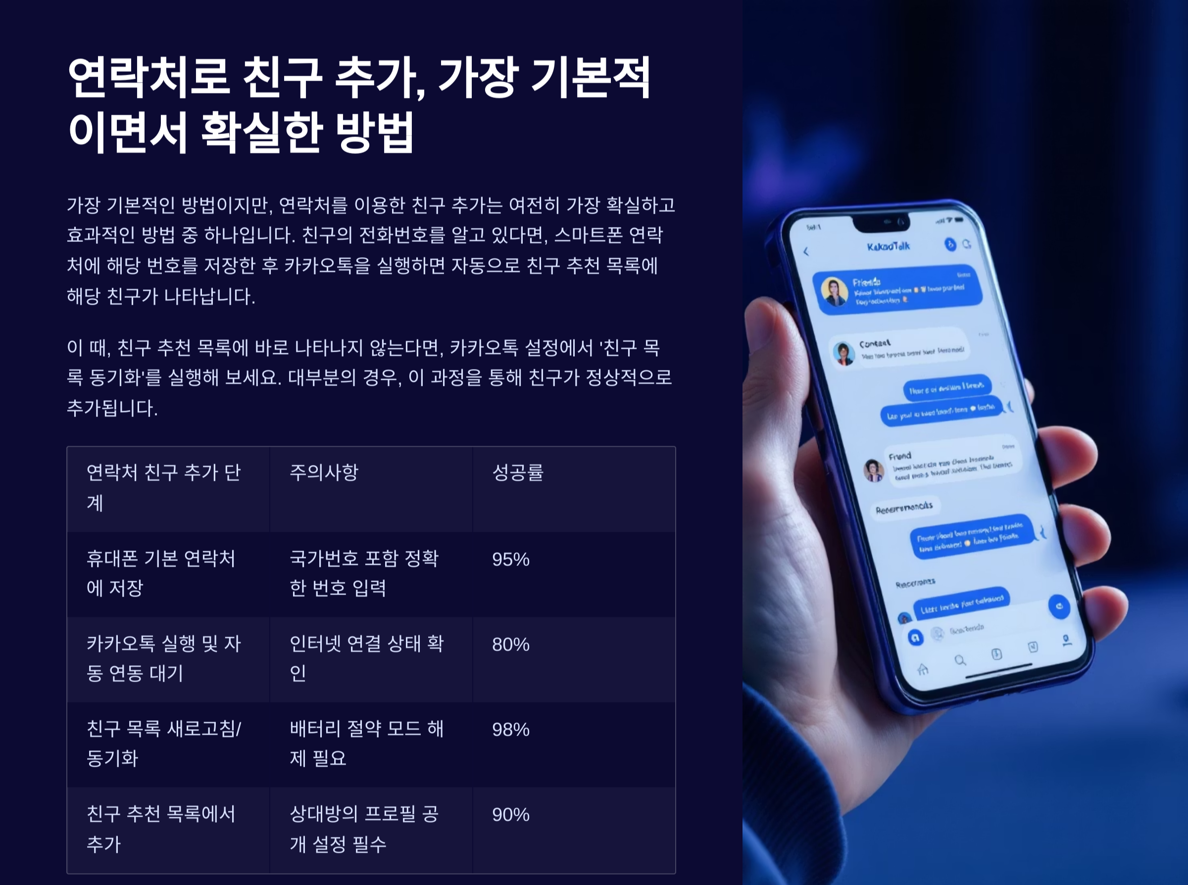 | 연락처 친구 추가 단계 | 주의사항 | 성공률 |