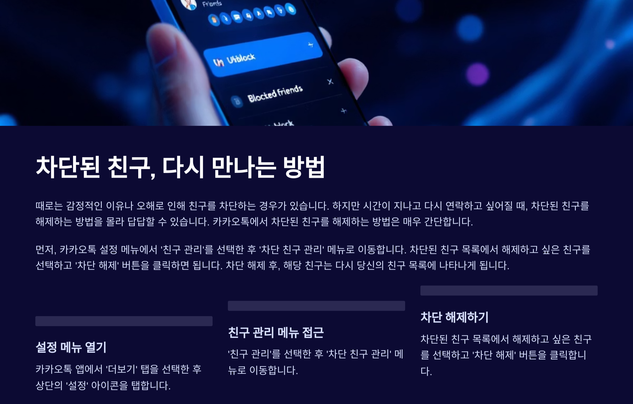 때로는 감정적인 이유나 오해로 인해 친구를 차단하는 경우가 있습니다. 하지만 시간이 지나고 다시 연락하고 싶어질 때, 차단된 친구를 해제하는 방법을 몰라 답답할 수 있습니다. 카카오톡에서 차단된 친구를 해제하는 방법은 매우 간단합니다.