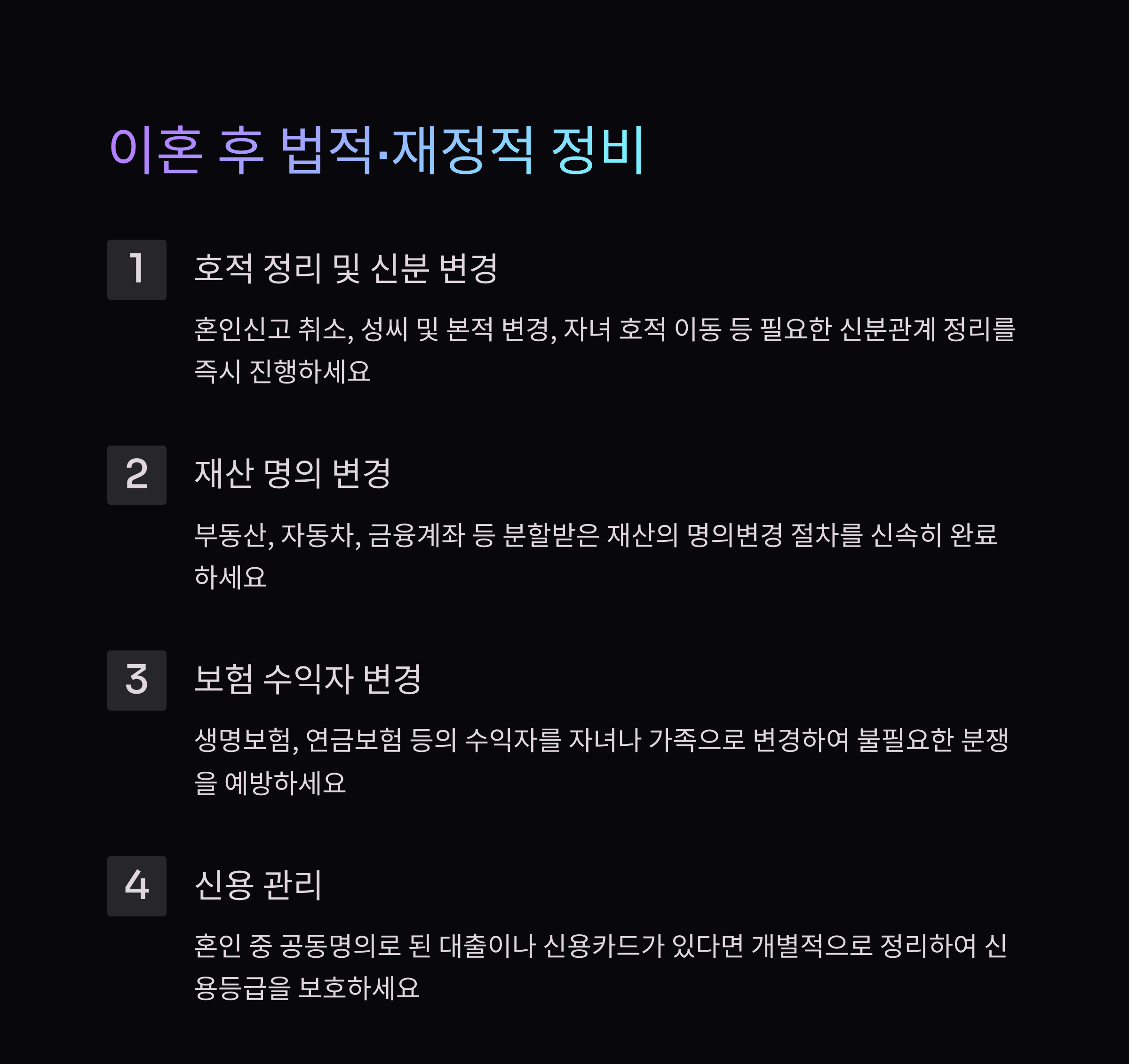 • 재정적인 계획 수립: 이혼 후의 재정 상태를 고려하여 예산을 재조정하고, 새로운 생활에 필요한 재정 계획을 세우는 것이 중요합니다.