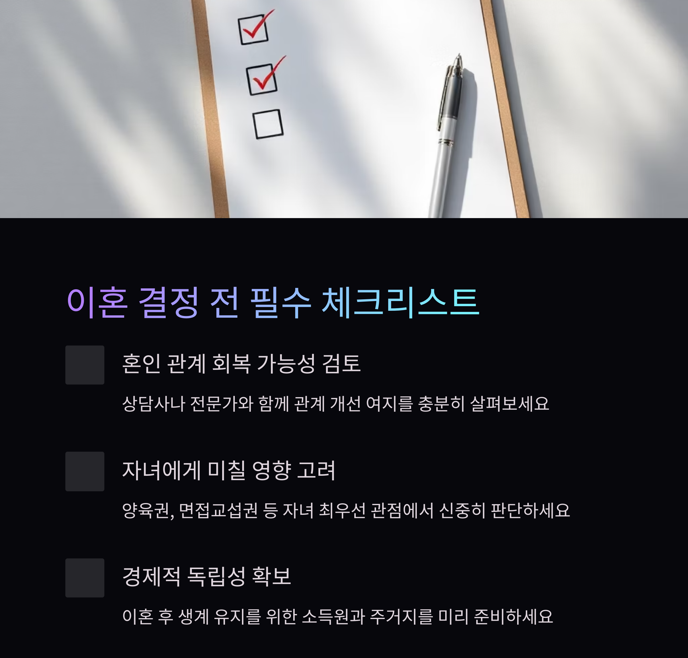 협의이혼을 고려하고 계신다면, 혼자 결정하지 마시고 가족, 친구, 전문가와 충분히 상의하시기 바랍니다. 때로는 부부 상담을 통해 관계를 회복할 수 있는 방법을 찾을 수도 있습니다. 만약 이혼이 불가피한 상황이라면, 이 글의 내용을 참고하여 체계적으로 준비하시고, 서로에게 상처가 되지 않는 방향으로 진행하시길 권합니다.