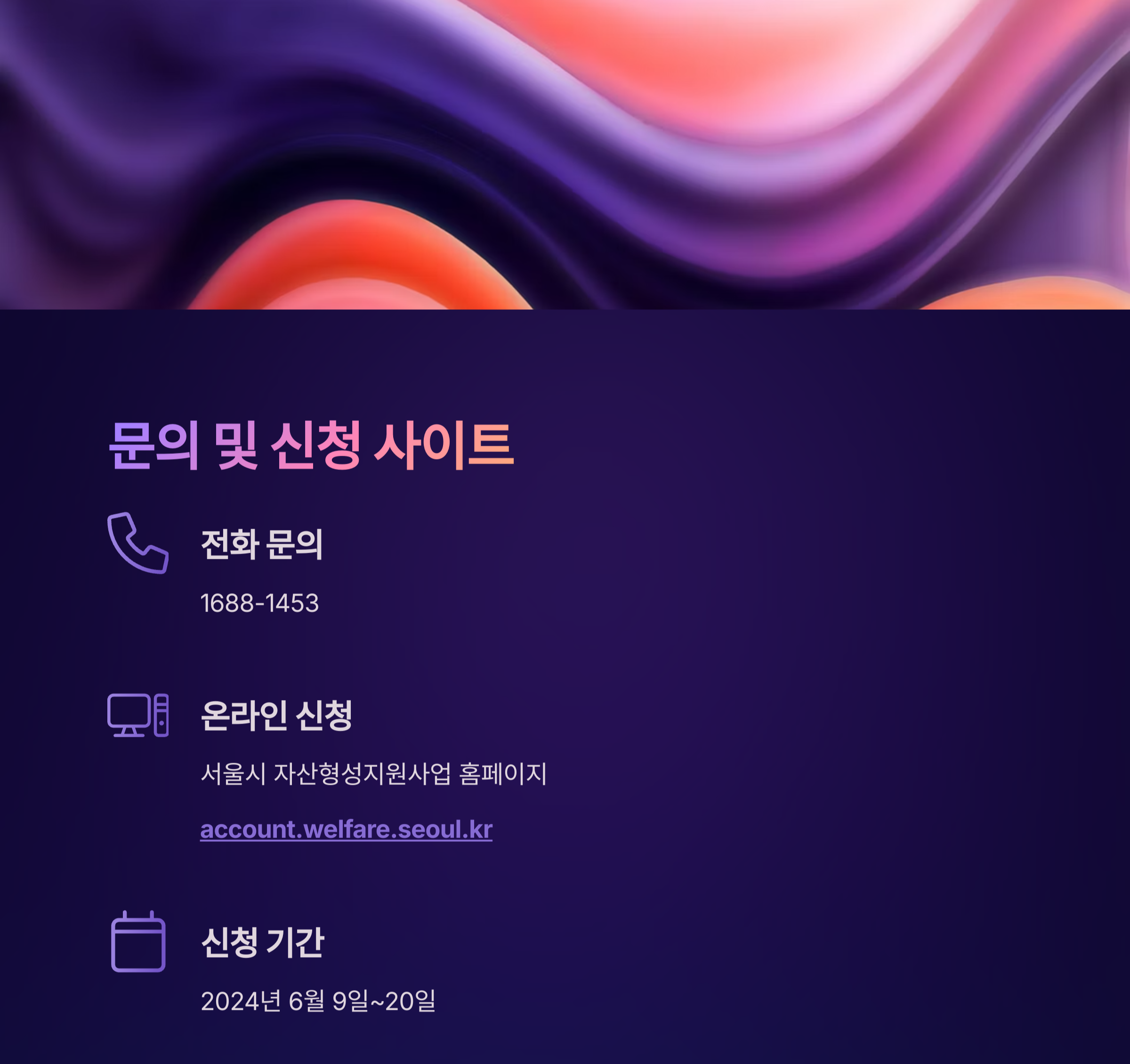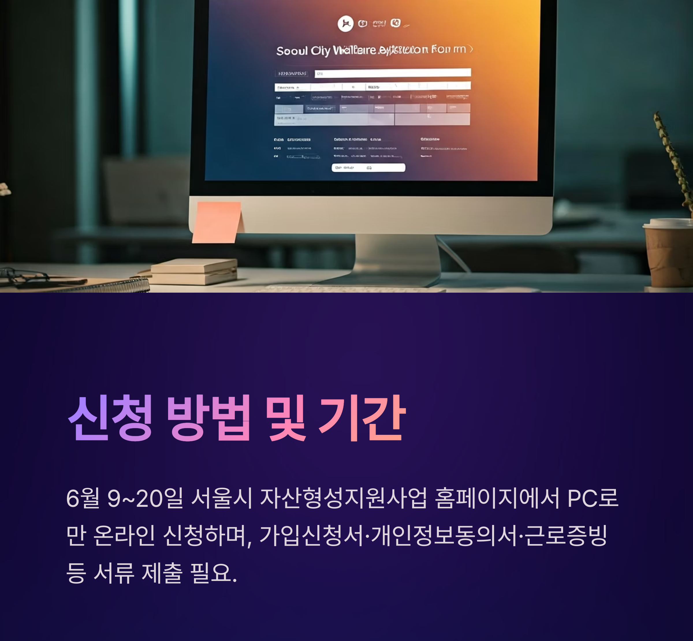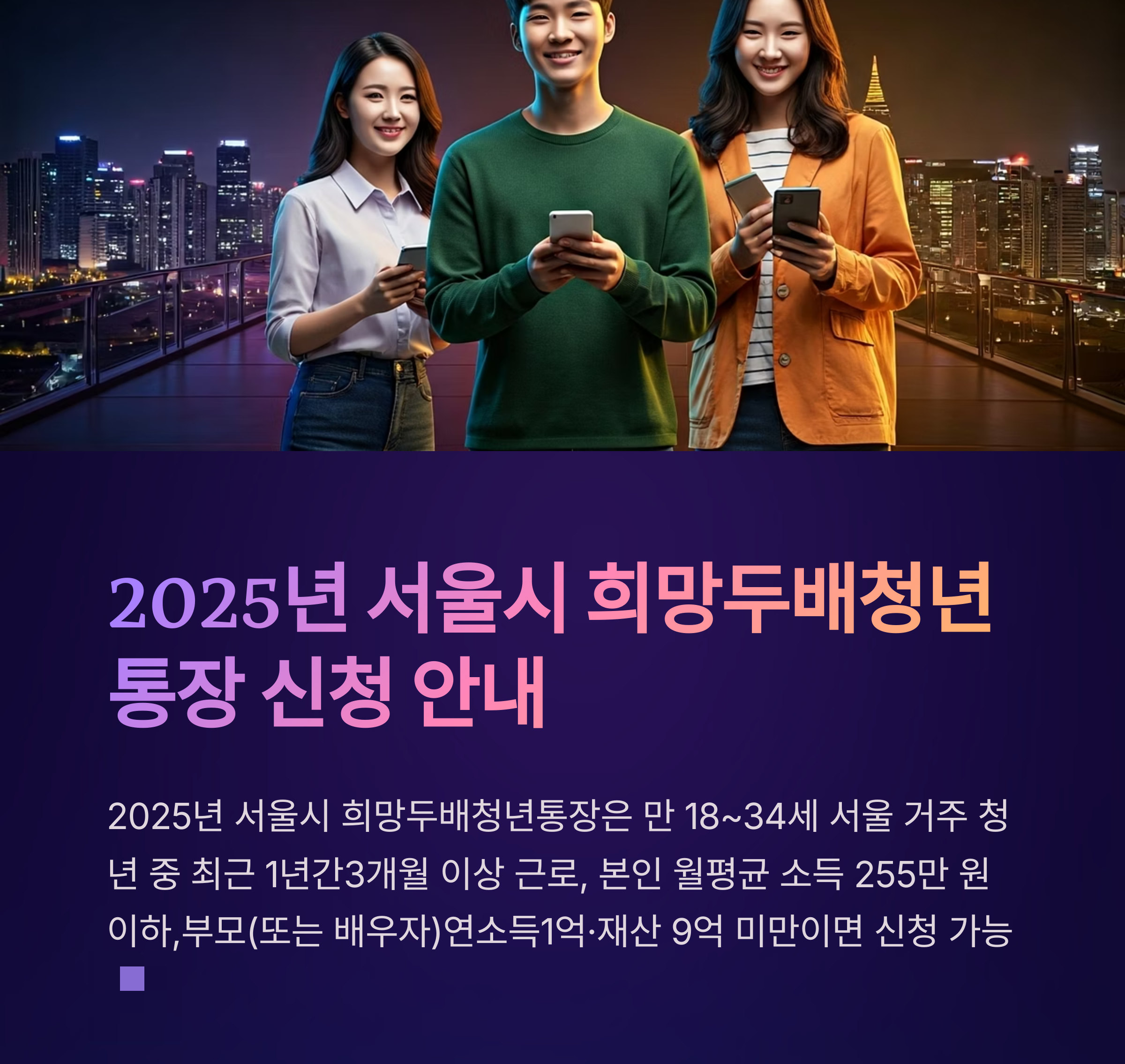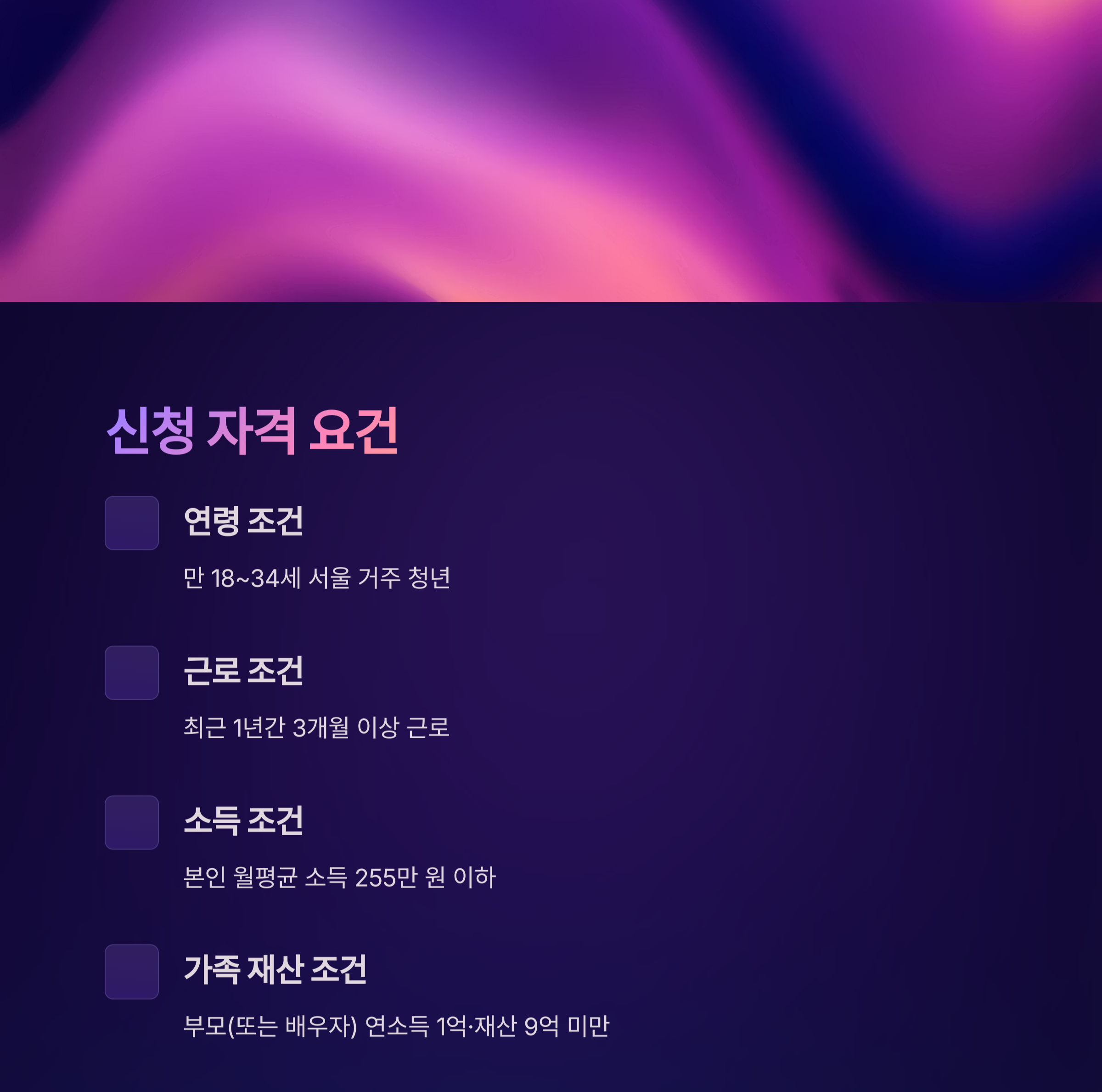 - 신청 자격: 만 19~34세 서울시 거주 청년 중 소득·자산 기준을 충족해야 합니다. (중위소득 150% 이하, 개인 자산 1억 원 이하)