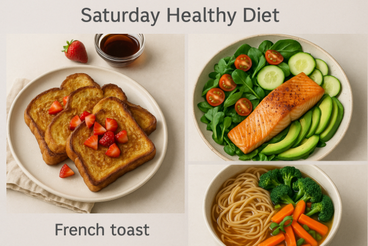 토요일 통밀 프렌치토스트 연어 샐러드 닭가슴살 누들 + 야채