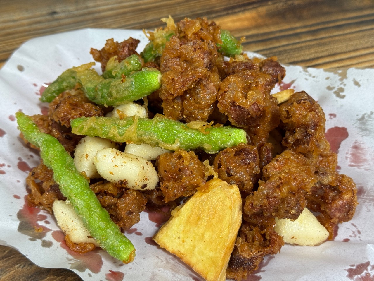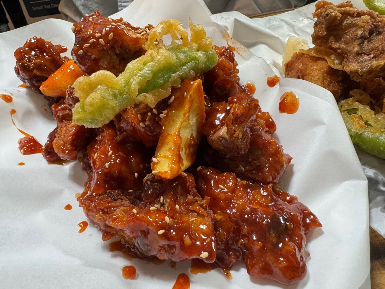 고구마 튀김과 꽈리고추 튀김이 가장 인기가 높습니다. 고구마 튀김은 달콤한 맛으로 아이들이 좋아하고, 꽈리고추 튀김은 치킨의 느끼함을 잡아주는 개운한 맛으로 어른들에게 인기입니다.
