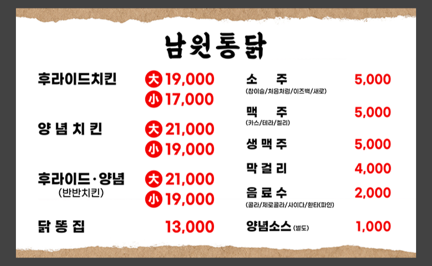 후라이드치킨 중자 15,000원, 대자 20,000원 정도이며 양념치킨은 1,000원 추가입니다. 사이드 메뉴는 3,000-5,000원대로 전반적으로 합리적인 가격입니다. 3-4명 가족이 배불리 먹을 수 있는 구성이 25,000-30,000원 정도입니다.