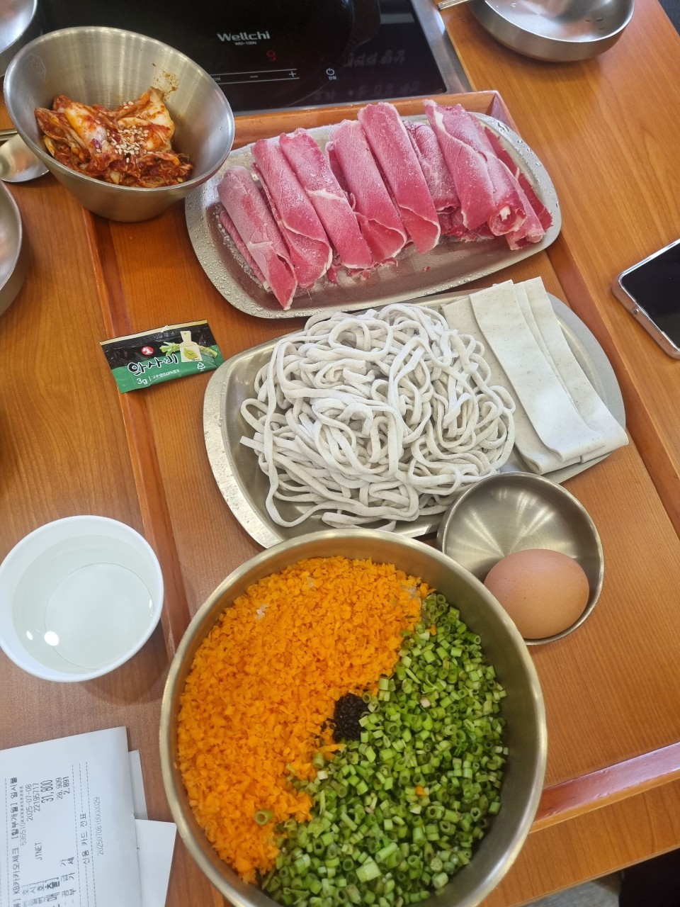 소고기 샤브샤브용 300g, 각종 버섯(느타리, 팽이, 새송이) 200g, 미나리 100g, 배추 적당량, 칼국수 면 2인분을 준비합니다.