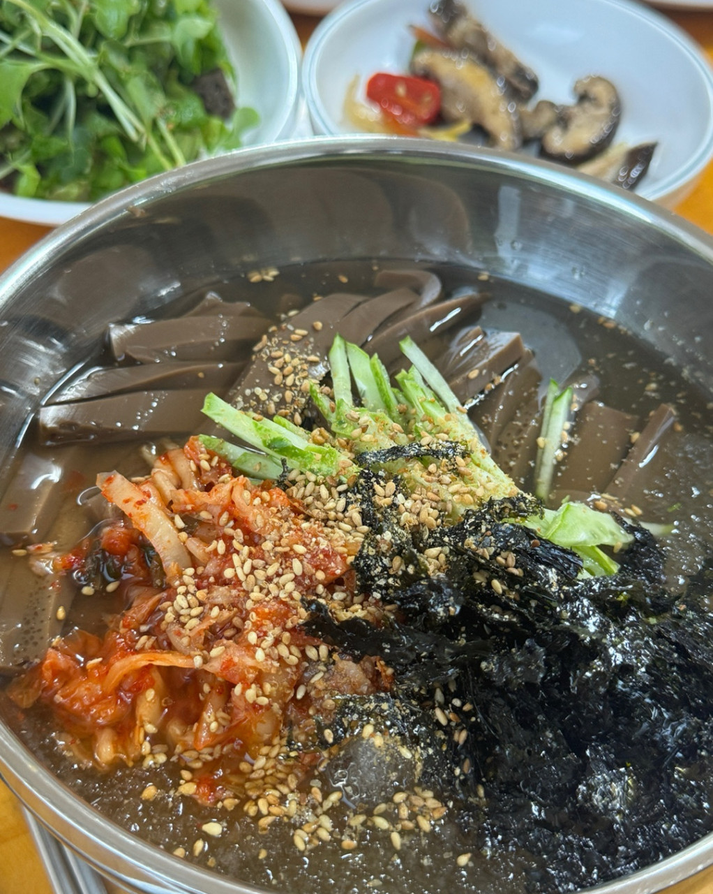 - 묵사발 (9,000원): 시원한 동치미 국물 베이스로 여름철 별미로 인기가 높습니다. 새콤달콤한 국물과 도토리묵의 쫄깃한 식감이 조화롭게 어우러져 해장음식으로도 탁월한 효과를 보입니다.