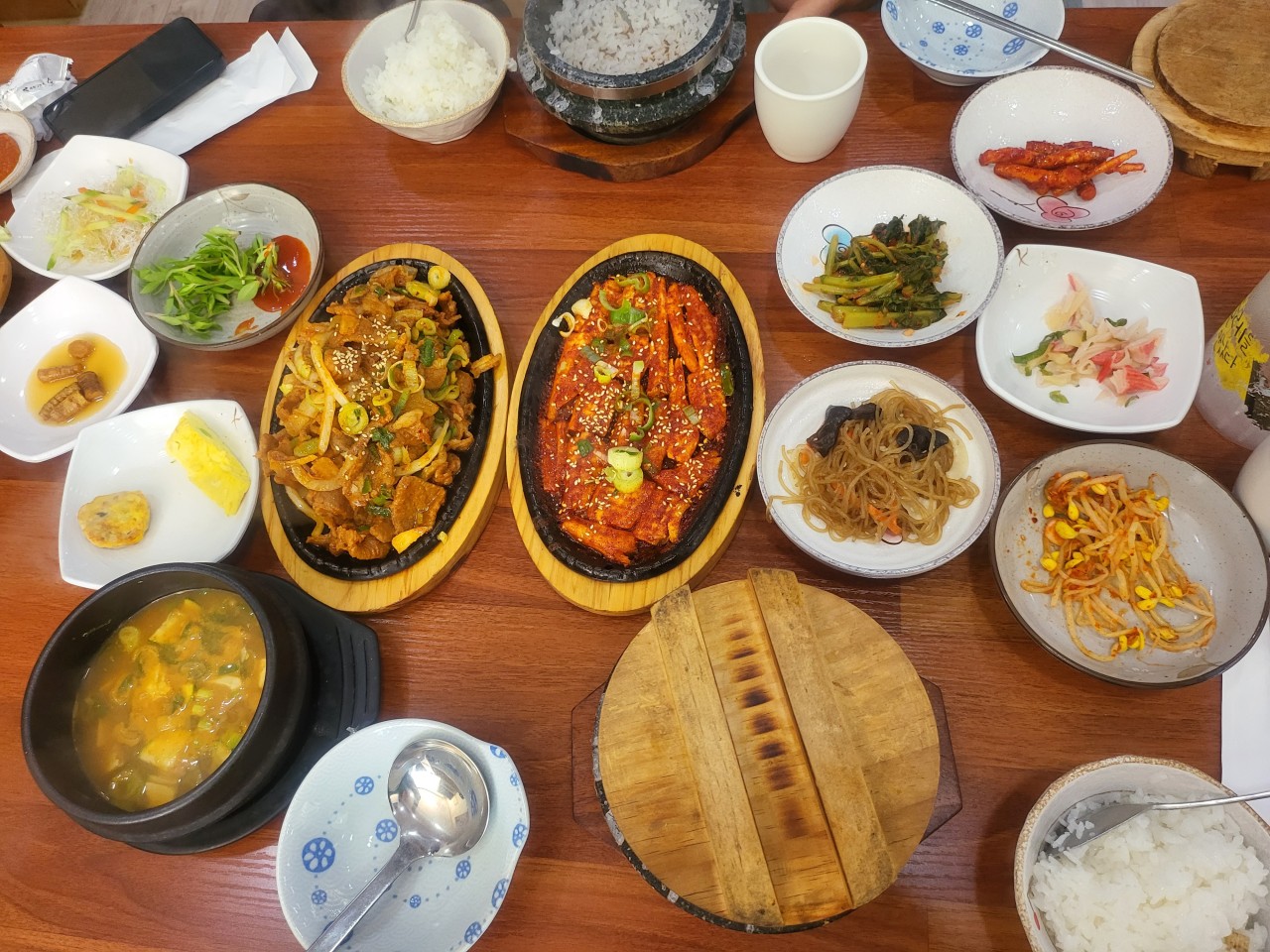 돌솥밥 + 돼지고기에 각종 야채와 함께 볶아낸 불고기와 된장찌개 등 10여가지 밑반찬