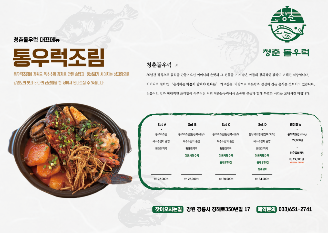 강릉시 창해로350번길 17에 위치한 청춘돌우럭&물회는 생생정보 고수의부엌에서 소개될 법한 진정한 통우럭조림 맛집입니다. 강문해변 바로 앞에 자리잡은 이곳은 2층 건물로 이루어져 있어요.