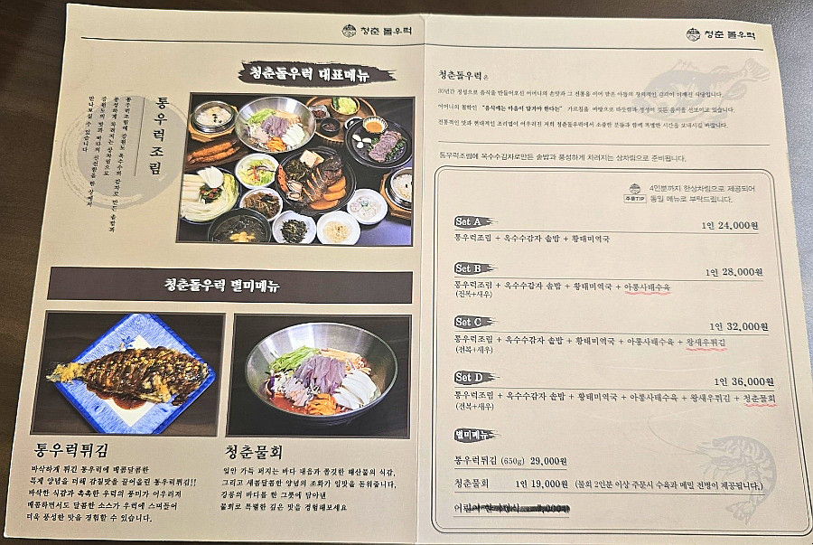 청춘돌우럭물회의 메뉴는 정말 생생정보 고수의부엌에서 소개될 만한 구성이에요. 통우럭조림을 중심으로 한 세트 메뉴들이 다양하게 준비되어 있습니다.