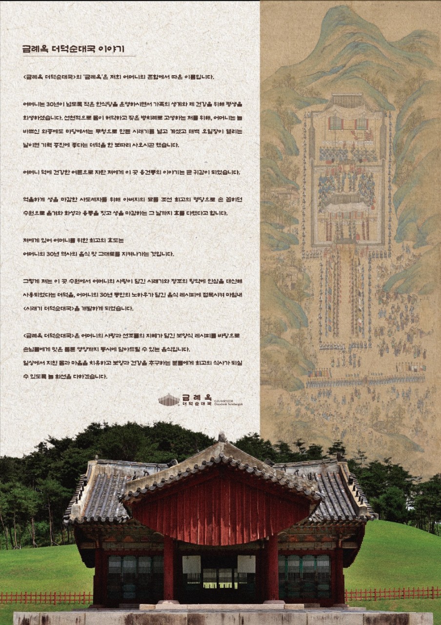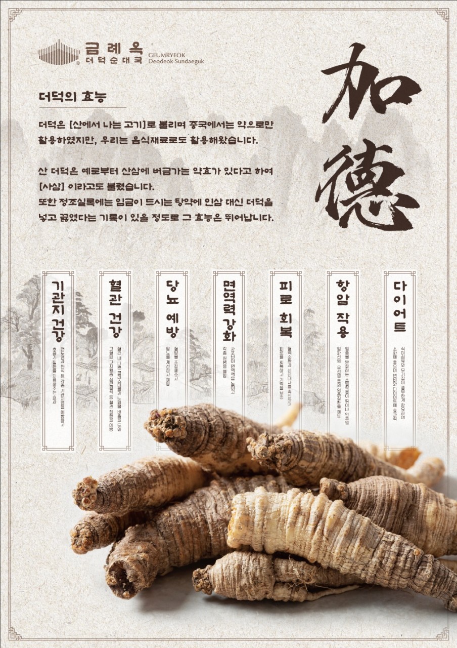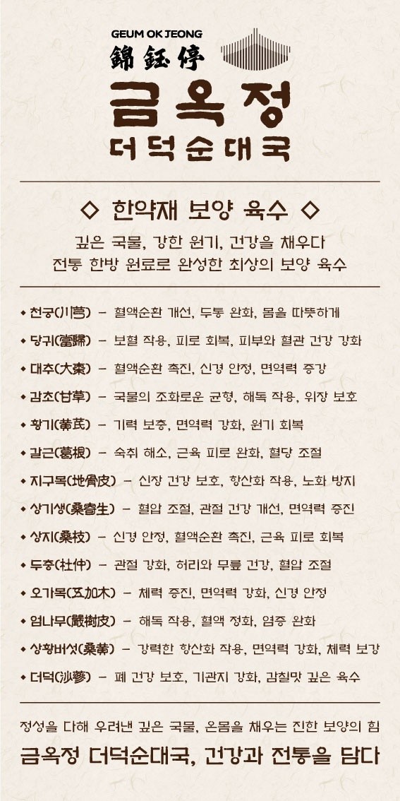 | 육수 제조법 | 12시간 이상 우림 | 진한 더덕 향과 깊은 맛 |